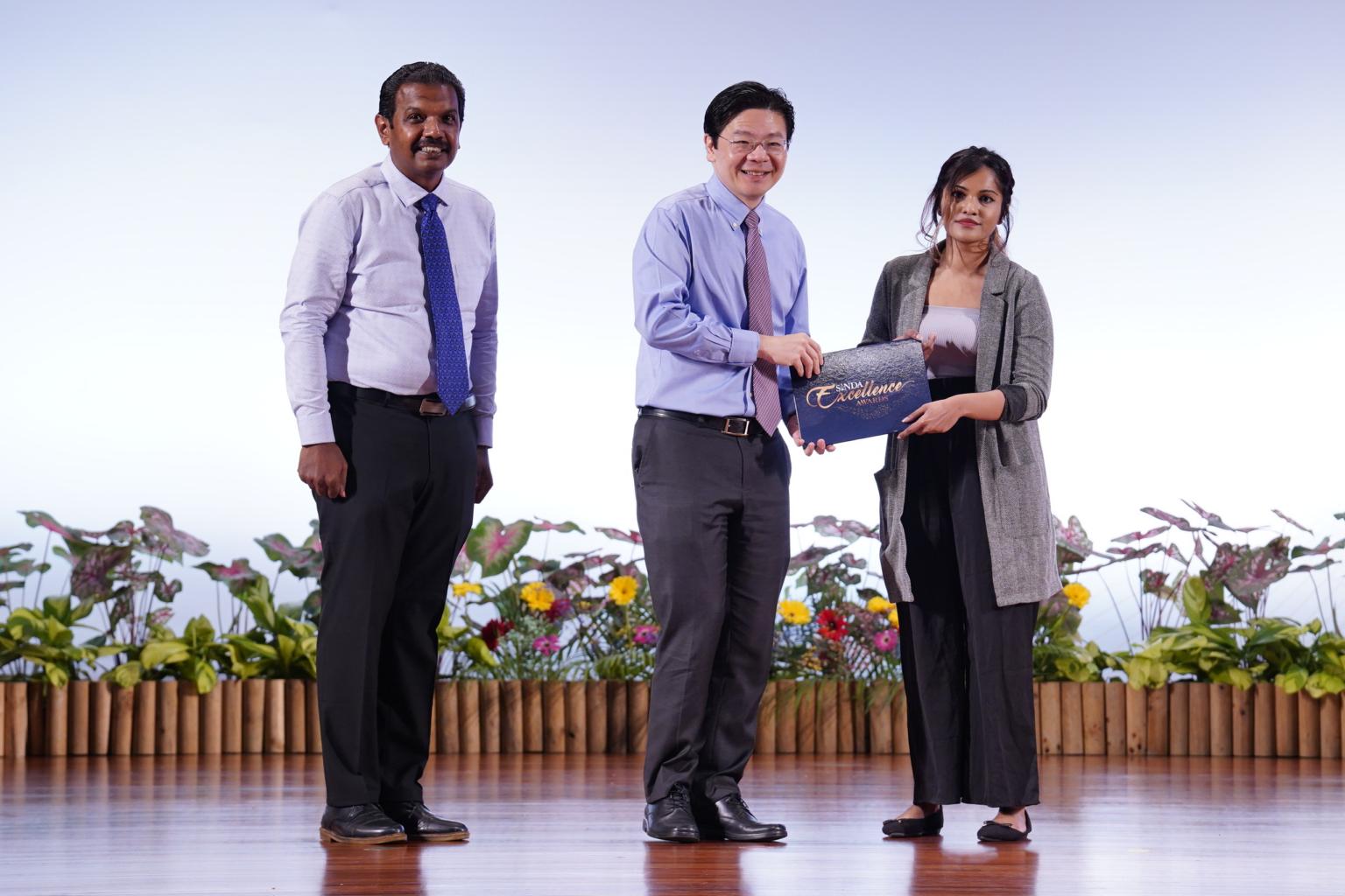 Mr Aman Singh Rahman (far right) receiving the Sinda Excellence Award from Senior Minister Tharman Shanmugaratnam and Sinda chief executive Anbarasu Rajendran.
