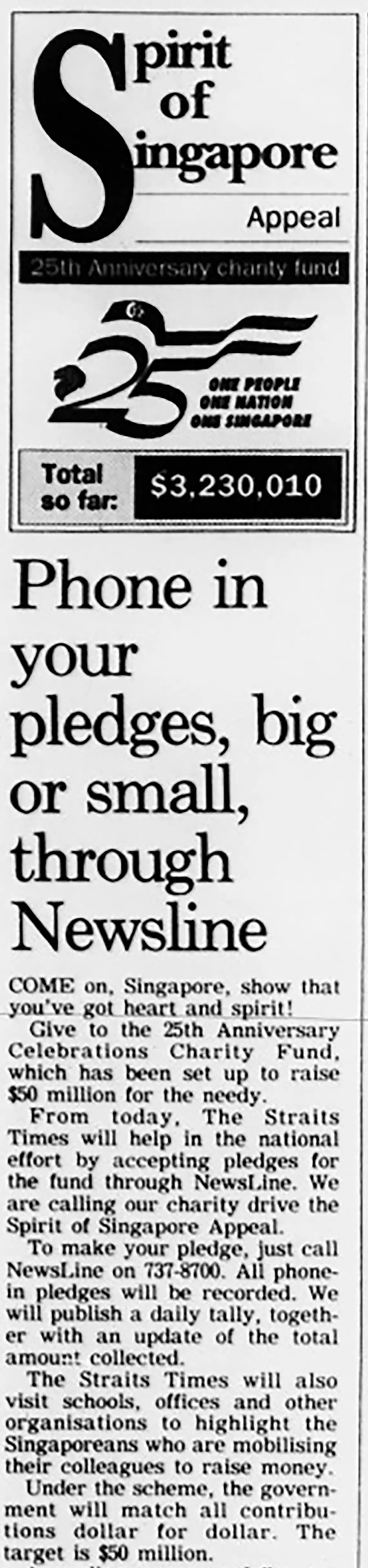 A national 25th Anniversary Charity Fund was set up to raise $50 million for Singaporeans in need. The Straits Times signed up to raise funds with its own Spirit of Singapore Appeal, in which it set up a dedicated phone line to receive phone-in pledges.