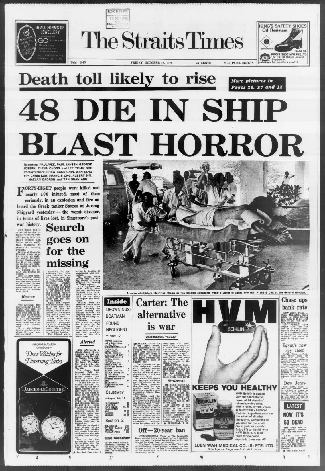 On Oct 12, 1978, an explosion on the Greek tanker Spyros at Jurong Shipyard killed 76 and injured 69 others. It was Singapore’s worst post-war industrial disaster.