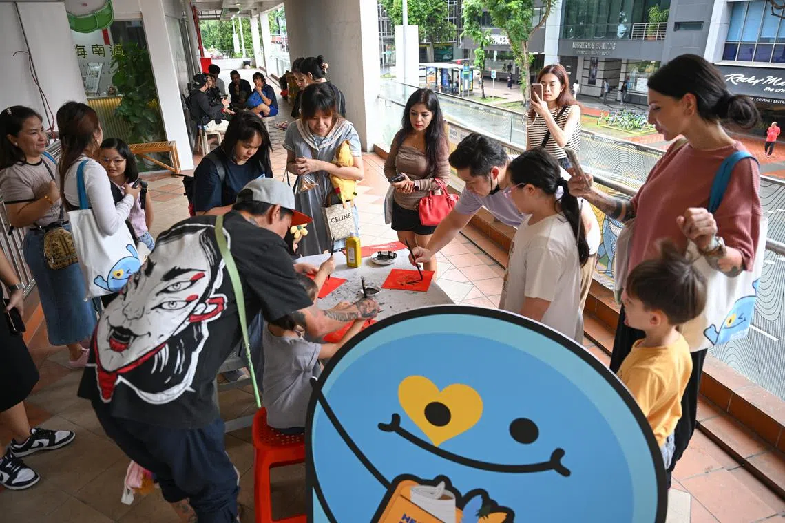 Mr Chen introducing the art of Chinese calligraphy during a media tour on Nov 30, for this year’s Heartlands Festival, where a new mascot Hearty was revealed.