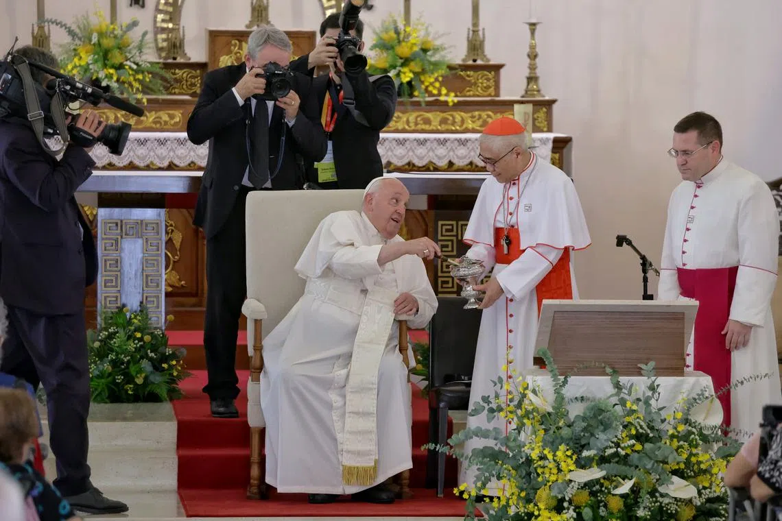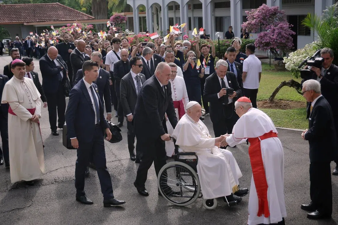 As he made his way around the grounds, the Pope also paused to spend a private moment with Archbishop Emeritus Nicholas Chia, 86, who is a resident at St Theresa’s Home.