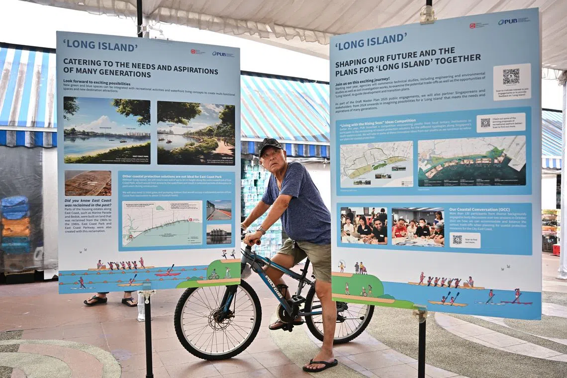A cyclist reading about new plans for the estate, such as the development of Marine Terrace MRT station.