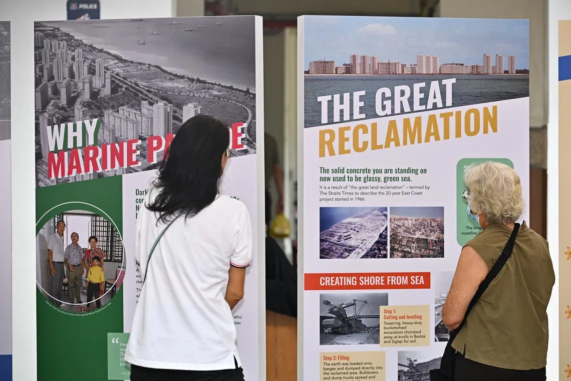 Residents looking at an exhibition booth showcasing the history of Marine Parade.