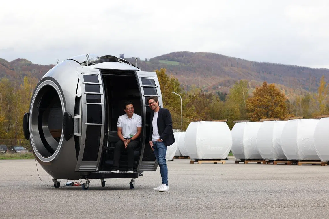 Passengers will enter the silvery, mirrored cabin through double doors that slide open on both sides, and take in views through a large front-facing porthole window and a transparent glass bottom. Outward-opening windows enhance natural cross-ventilation too.