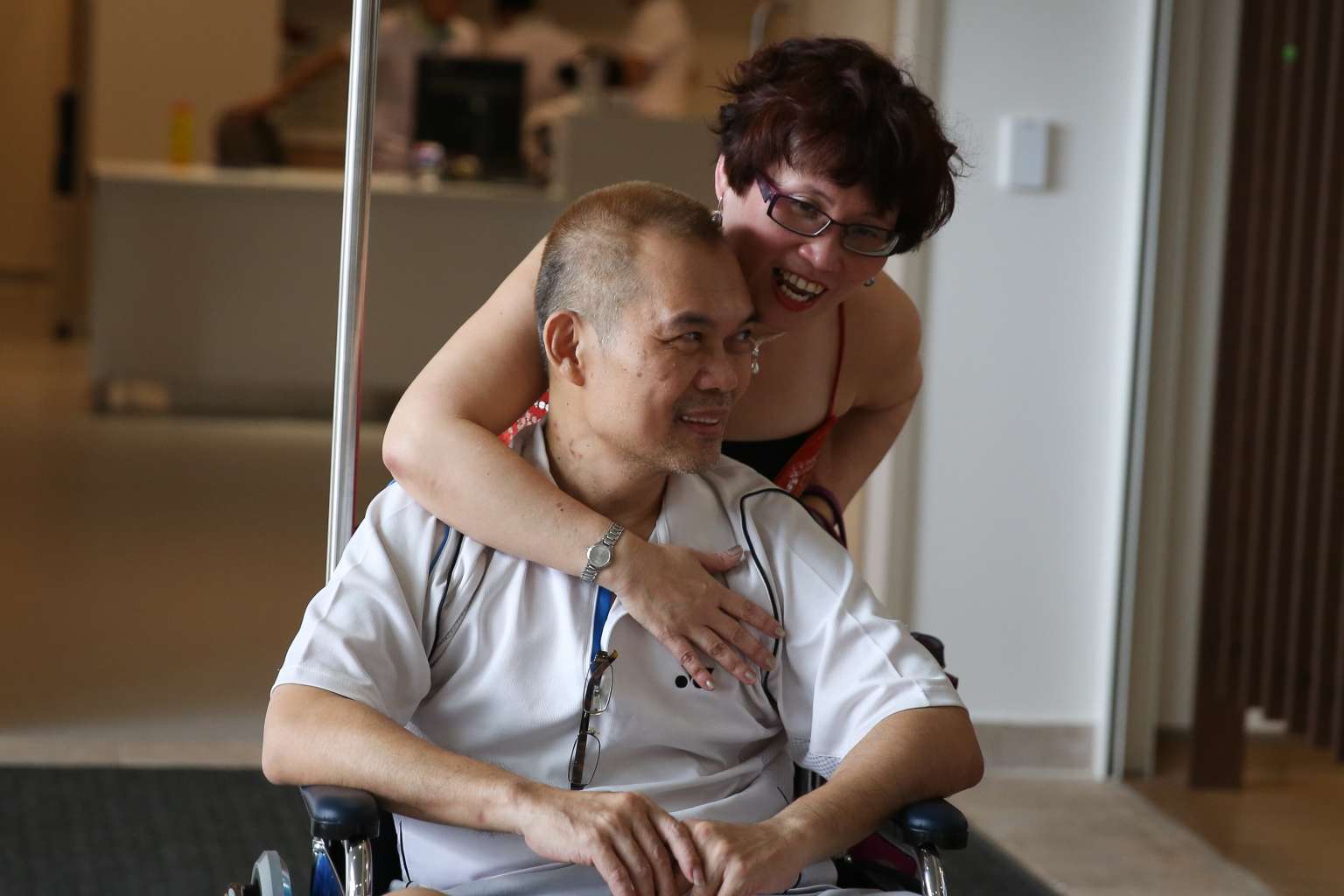 Sim Tharn Chun (front), accompanied by his wife Cathryn Sim, being discharged from Yishun Community Hospital.