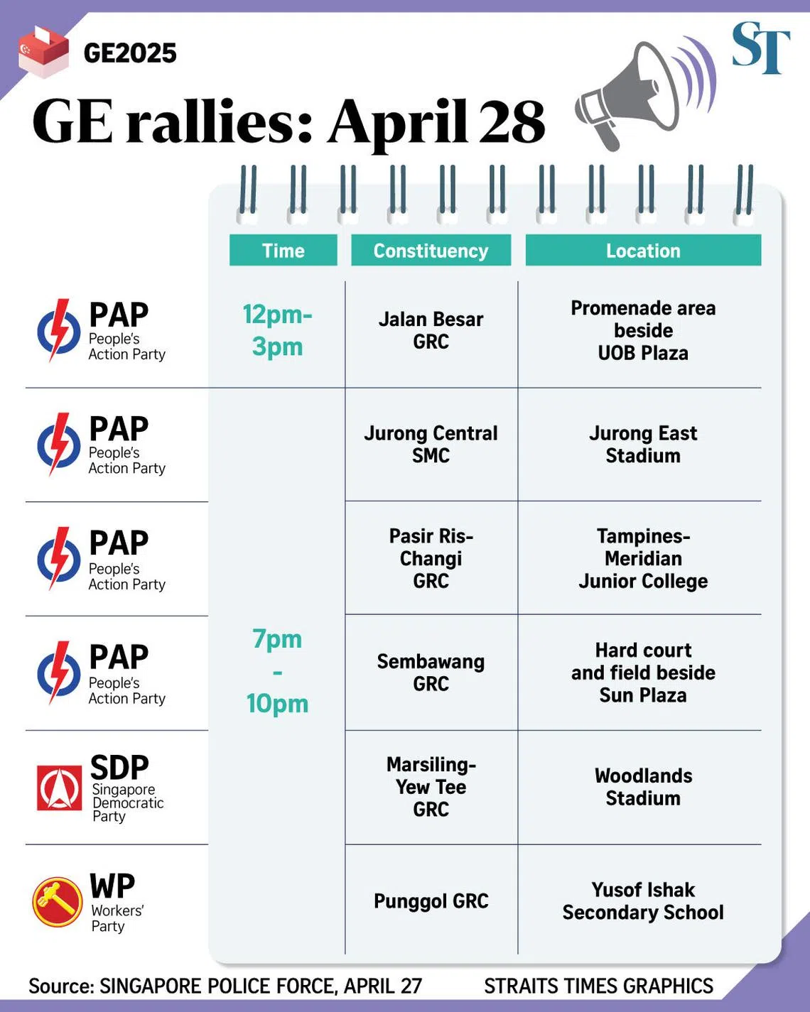 SINGAPORE – Six election rallies will be happening on April 28, as political parties enter the last week of hustings before the general election on May 3.