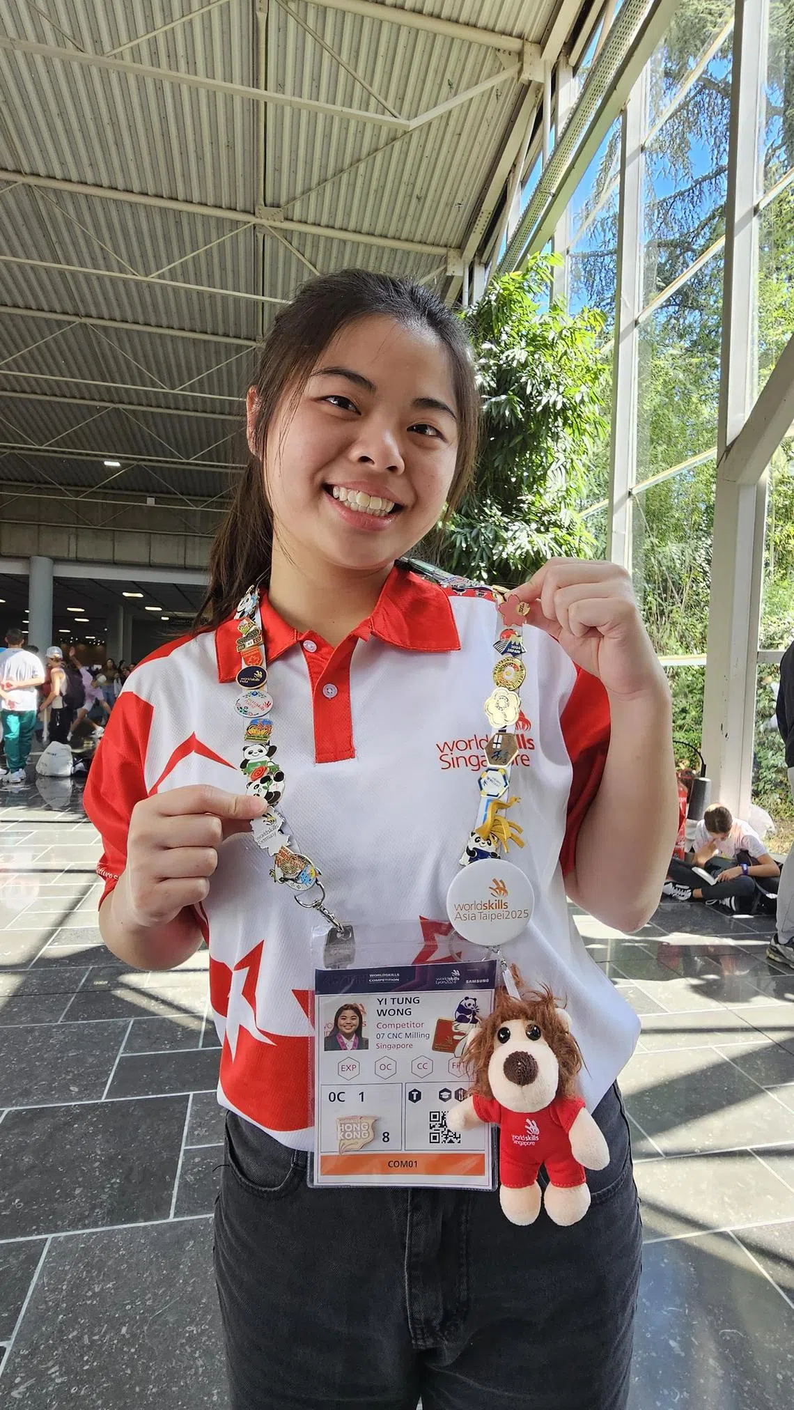 Ms Shanice Wong showing the badges she exchanged with her competitors from other countries at WorldSkills Lyon 2024.