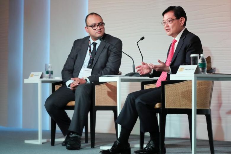 Deputy Prime Minister Heng Swee Keat speaking at the Hindustan Times-MintAsia Leadership Summit moderated by Hindustan Times editor Sukumar Ranganathan at Shangri-La Hotel on Sept 6, 2019.