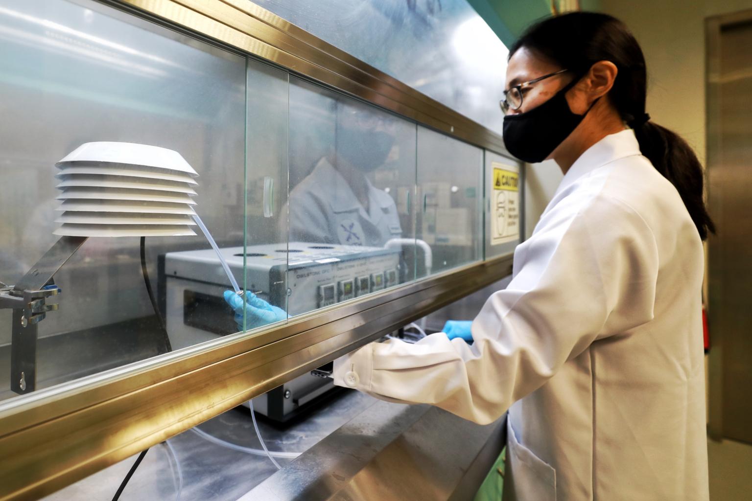 A staff member testing the eNose unit (left) using gases of different concentrations from a gas standard generator in a laboratory, on Aug 17, 2021.