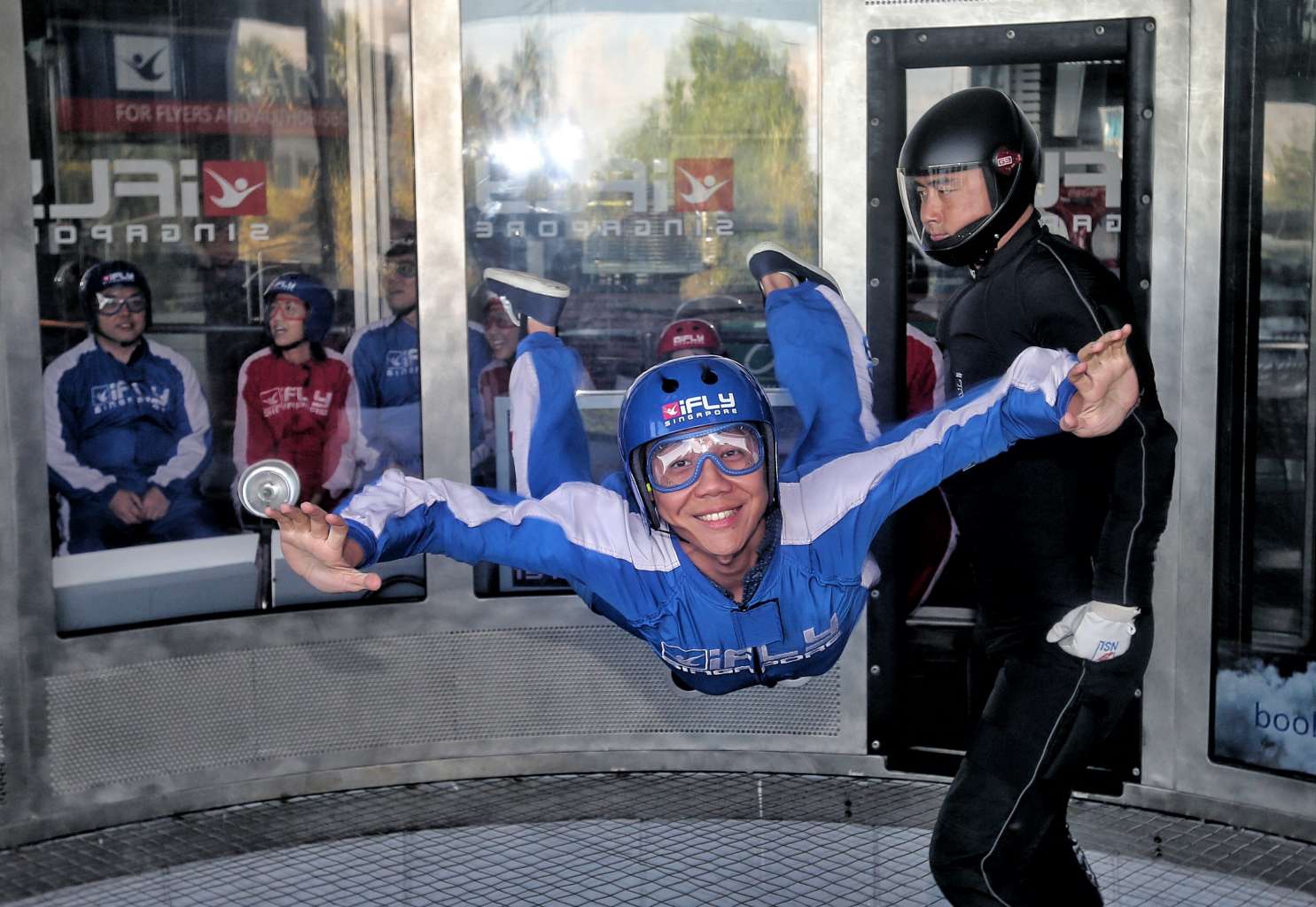 Trying to contort one's body in an aerodynamic fashion while flailing in mid-air proved tricky at Sentosa's iFly Singapore.