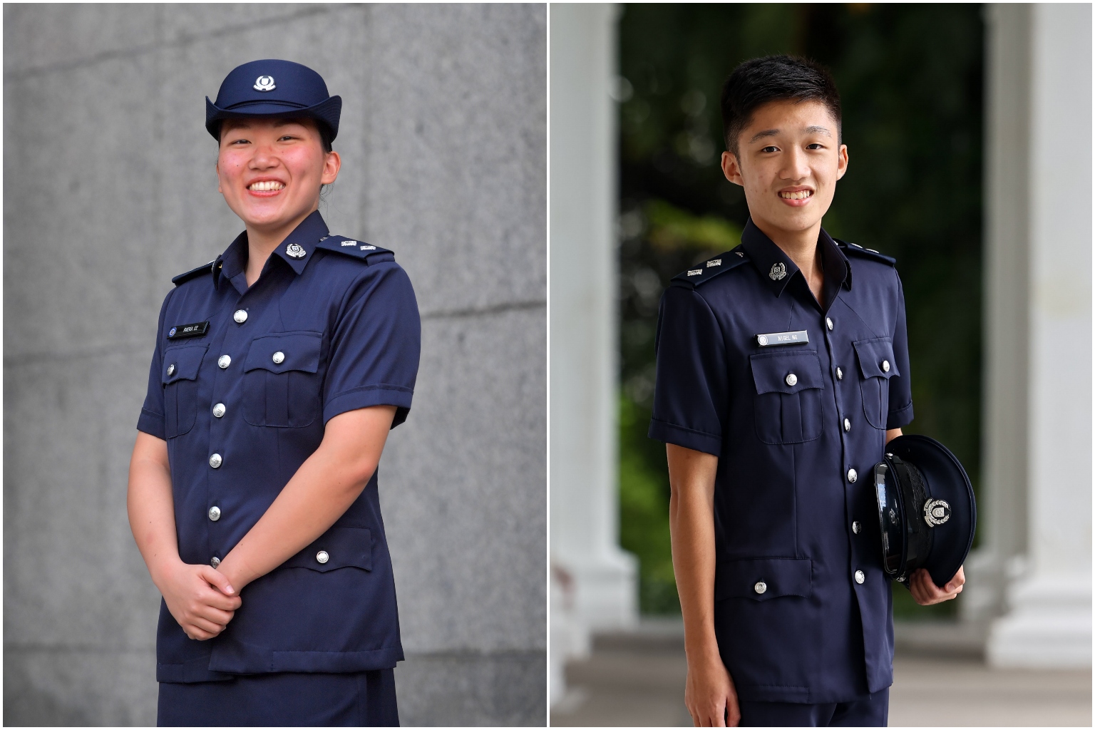 Inspectors Raeka Ee Pei Ying (left) and Nigel Ng Hong Xun received the Singapore Police Force Scholarship.