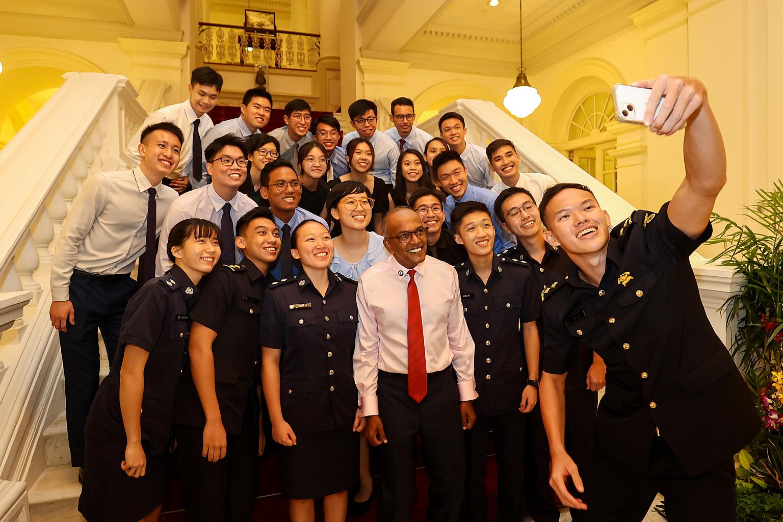 Law and Home Affairs Minister K. Shanmugam (front, centre) with scholarship recipients at the Istana on Aug 18, 2022.