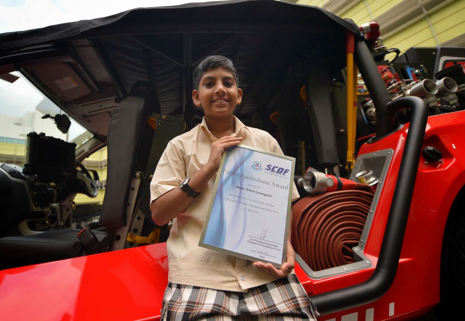 Yishun Primary School pupil Ashvin Gunasegaran was presented with the Public Spiritedness Award by the SCDF for providing help to the victims of a traffic accident.
