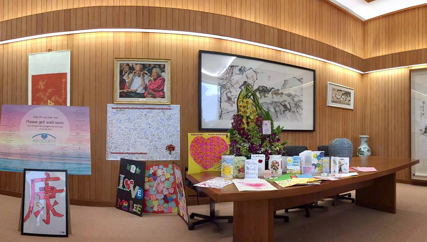 Cards, posters and an art piece of the Chinese character for "health" are among the many good wishes former prime minister Lee Kuan Yew, 91, has received since he was hospitalised at the Singapore General Hospital for severe pneumonia on Feb 5.