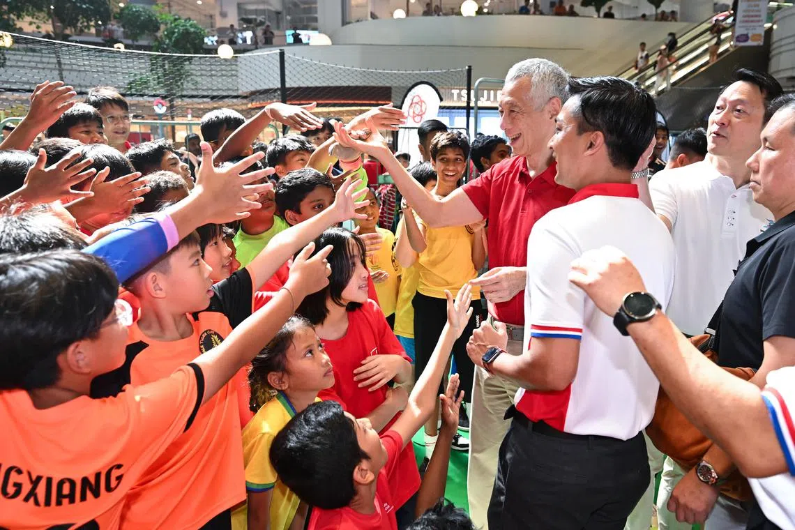 Senior Minister Lee Hsien Loong interacting with players of Street Soccer Tournament at Sengkang Grand Mall Community Plaza during the official opening of new Buangkok Community Club.