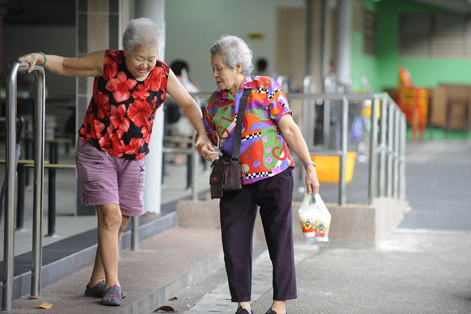Two elderly women holding hands while negotiating some steps at a hawker centre in Toa Payoh Lorong 8.