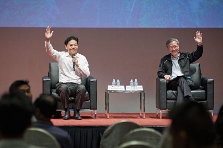 Minister for National Development Lawrence Wong (left) and Minister of State Sam Tan at a public forum on Tuesday (Aug 21).