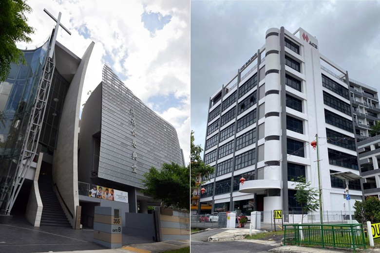 The Grace Assembly of God church's premises in Tanglin (left) and the Ace Building along Paya Lebar Road, where The Life Church and Missions is located on the second floor.