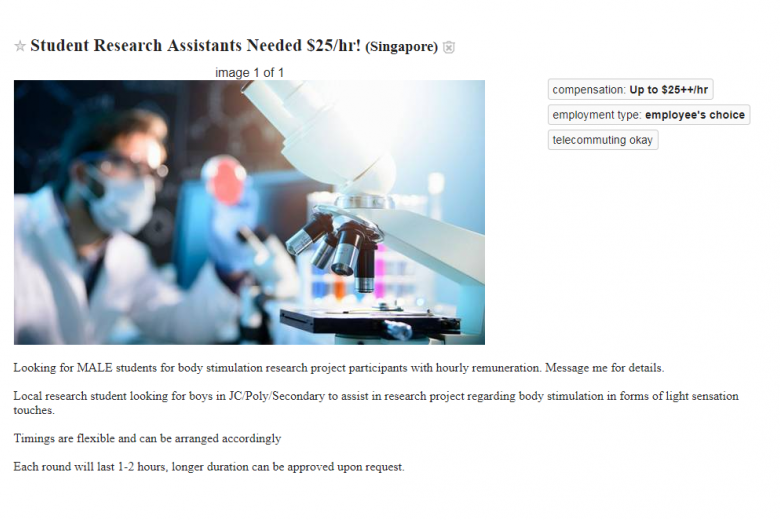 Cached copies of the purported ads on Craigslist and Gumtree said a "local research student" was looking for boys in junior colleges, polytechnics or secondary schools "to assist in research project regarding body stimulation in forms of light sensation touches".