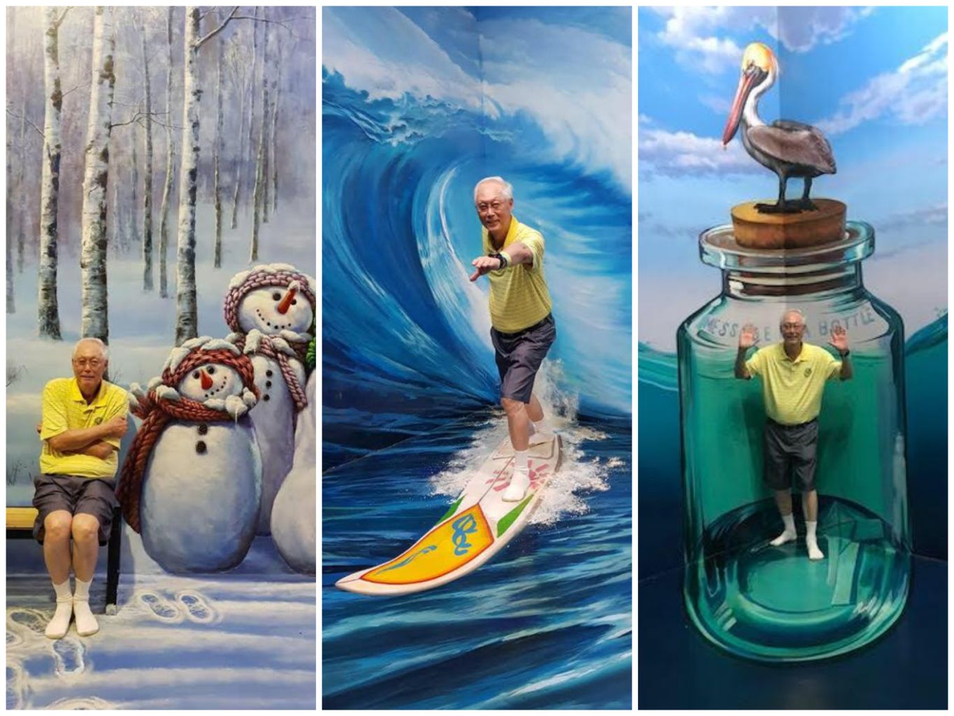 On Tuesday, ESM Goh posted another trio of photos, including one of him sitting on a swing on a beach, and another of him "trapped" inside a glass bottle in the open sea. "Every grandpa is a grandchild at heart," he wrote in the post, which was signed off with his initials.