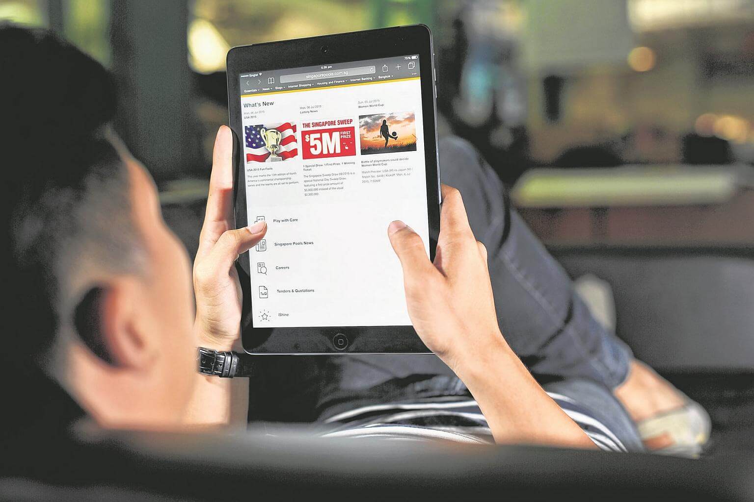 A posed photo of a man looking at the Singapore Pools website on a tablet.