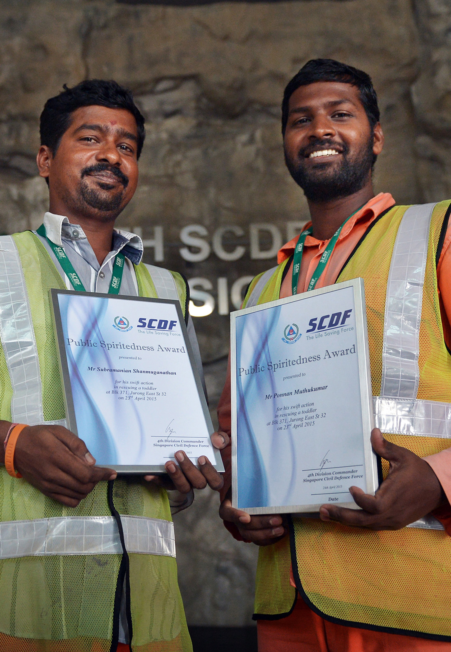 Mr Ponnan Muthukumar, 24, and Mr Subramanian Shanmuganathan, 35, had no thoughts for their own safety when they saw a toddler dangling precariously from a second-floor balcony in Jurong East in April.