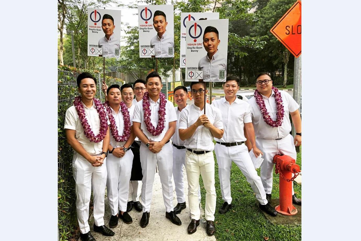 A photo of Mr Ong's Canberra gatecrash party in the Yishun-Sembawang area was posted by him on Facebook on Friday. It shows him and eight of his friends dressed in white short-sleeved shirts and pants. Some of them, including Mr Ong, wear flower garlands. Several members in the group also carry signboards that mimic election campaign posters, bearing a logo consisting of a circle and an exclamation mark in a colour scheme similar to the PAP logo.