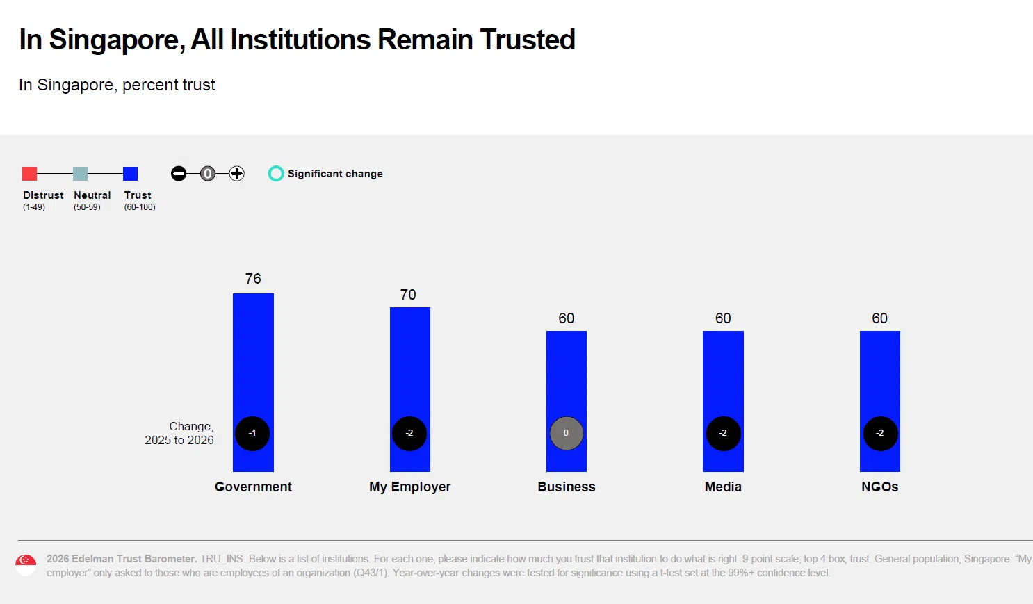 Singapore’s institutions remain trusted, with 76 per cent saying the Government is still the most trusted institution. Respondents’ employers follow at 70 per cent, and then the media, businesses and non-governmental organisations (NGOs), all at 60 per cent.