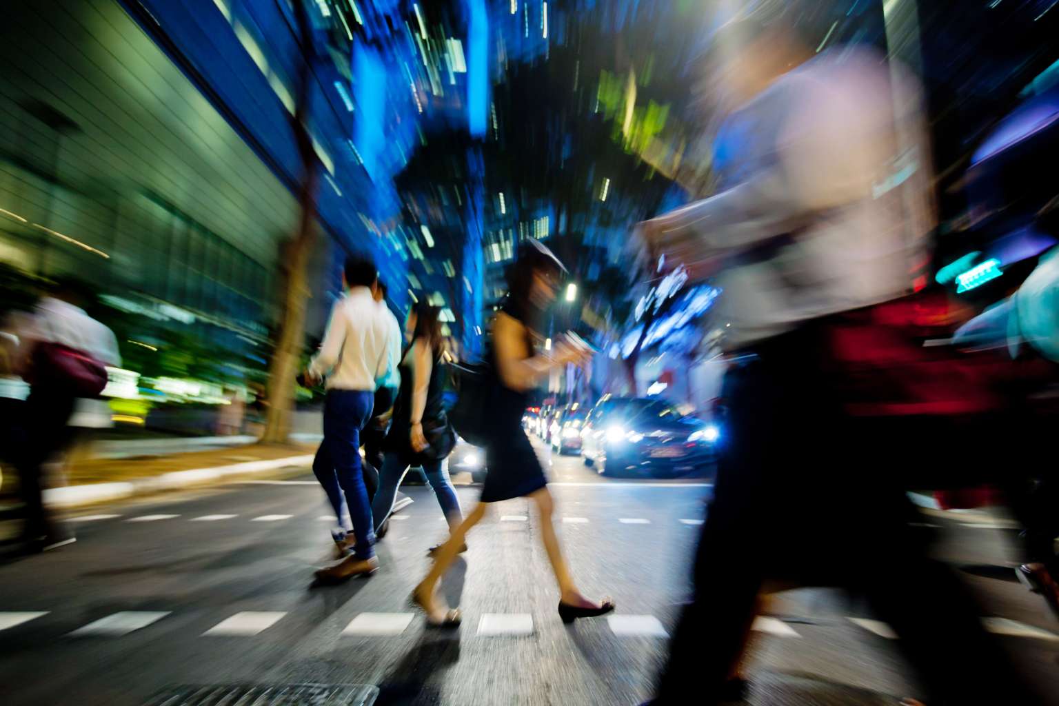Commuters cross a road at night in the central business district of Singapore on Oct 28, 2015.