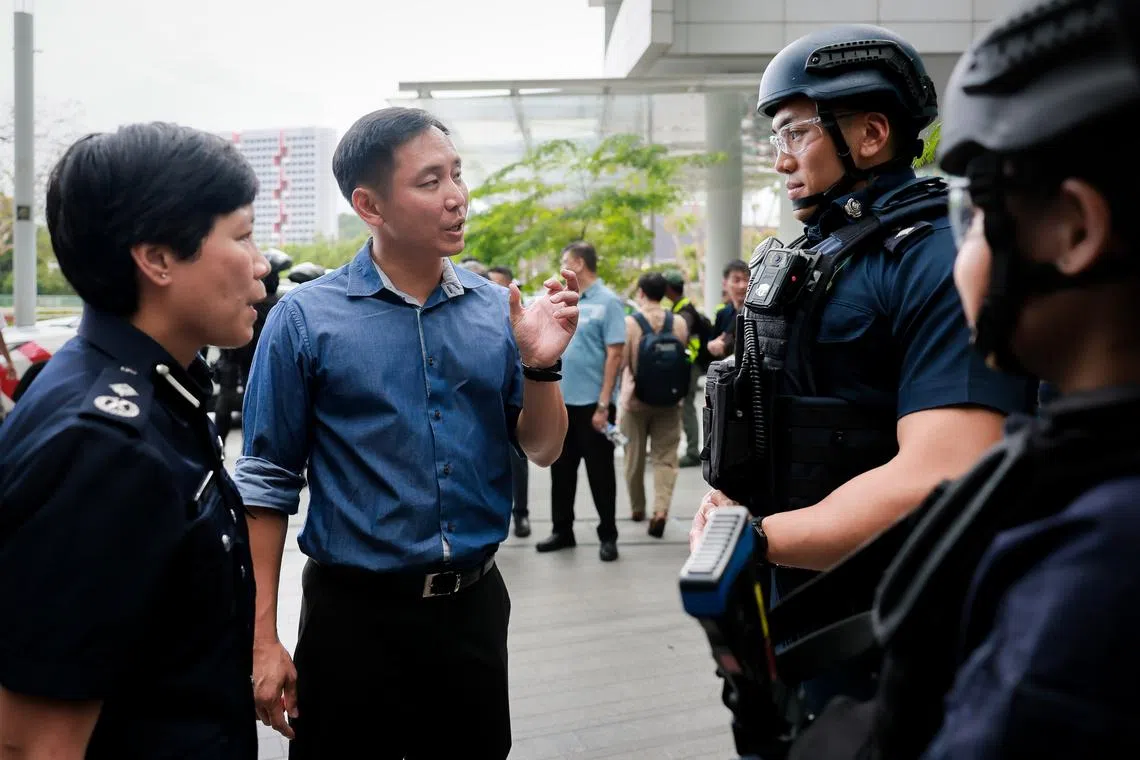 Minister of State for Home Affairs Goh Pei Ming (second from left) speaking to police officers who participated in the exercise.