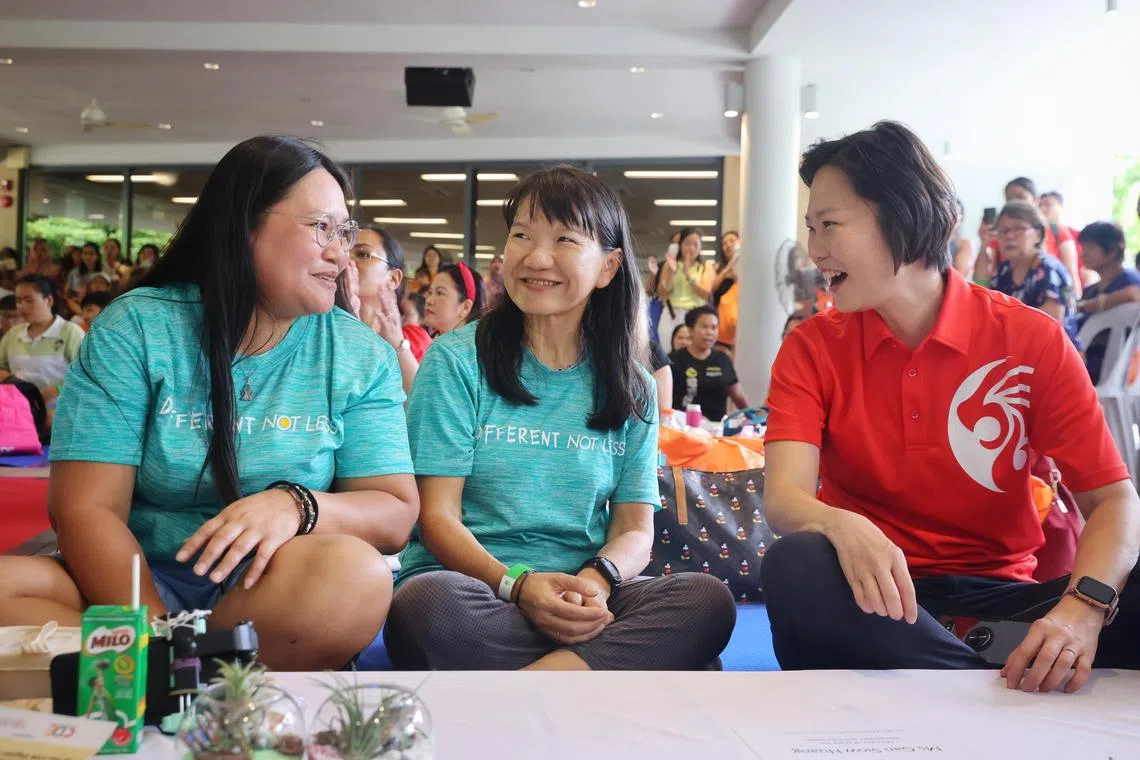 Minister of State for Manpower and Education Gan Siow Huang (right) joining Ms Clara Toh (centre) and her domestic helper Gilda Riona at the CDE International Migrants Day 2023 celebrations.