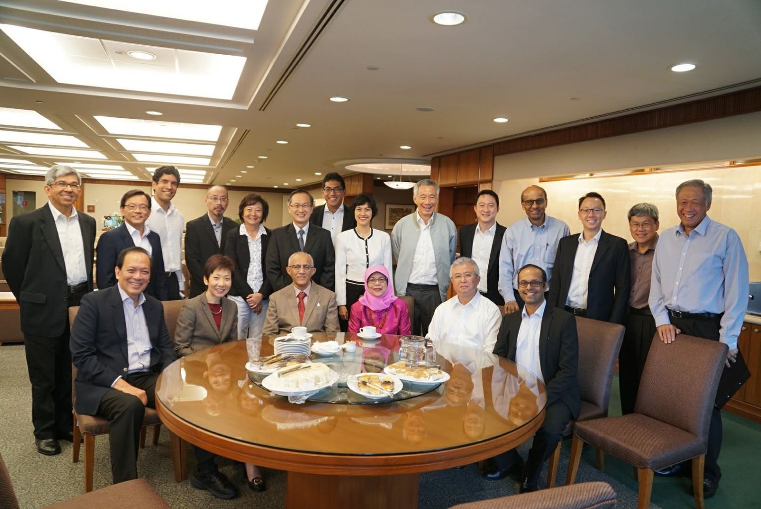 (Front row, from left) MP Charles Chong (Punggol East), Minister for Culture, Community and Youth & Leader of the House Grace Fu, Mr Mohamed Abdullah Alhabshee, Madam Halimah Yacob, NMP Thomas Chua, and NMP Mahdev Mohan. (Back row, from left) Minister for Communications and Information Yaacob Ibrahim, Mr Chong Kee Hiong from Bishan-Toa Payoh GRC, MP Vikram Nair (Sembawang GRC MP), NMP Randolph Tan, MP Lee Bee Wah (Nee Soon GRC MP), MP Lim Biow Chuan (Mountbatten MP) MP Daryl David (Ang Mo Kio GRC MP), MP Joan Pereira (Tanjong Pagar GRC), PM Lee Hsien Loong, Senior Minister of State, Ministry of Transport & Ministry of Health Lam Pin Min, Deputy Prime Minister and Coordinating Minister for Economic and Social Policies Tharman Shanmugaratnam, MP Tan Wu Meng (Jurong GRC MP), MP Png Eng Huat (Hougang MP), and Minister for Defence Ng Eng Hen.