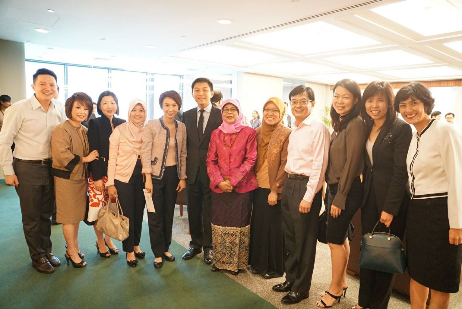 (From left) MP Henry Kwek (Nee Soon GRC), MP Lily Neo (Jalan Besar GRC), MP Cheryl Chan (Fengshan), MP Rahyu Mahzam (Jurong GRC), Senior Parliamentary Secretary, Ministry of Trade and Industry & Ministry of Education Low Yen Ling, Speaker of Parliament Tan Chuan-Jin, Madam Halimah Yacob, MP Intan Azura Mokhtar (Ang Mo Kio GRC), Minister for Finance Heng Swee Keat, MP Cheng Li Hui (Tampines GRC), MP Jessica Tan (East Coast GRC), and MP Joan Pereira (Tanjong Pagar GRC).