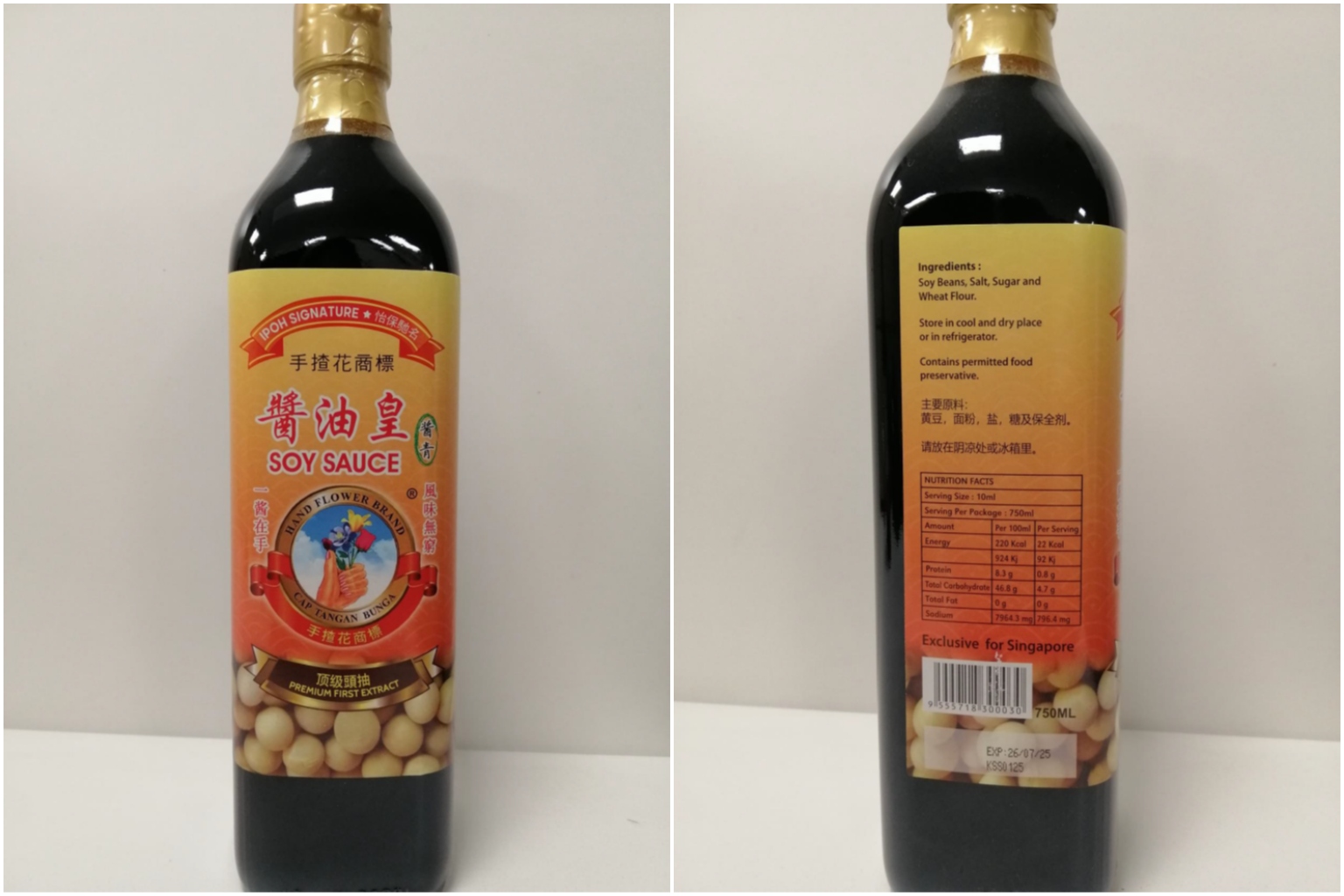 SINGAPORE - Hand Flower Brand Soy Sauce has been recalled by the Singapore Food Agency (SFA) due to the presence of an undeclared food additive that also exceeded the regulatory limit.
