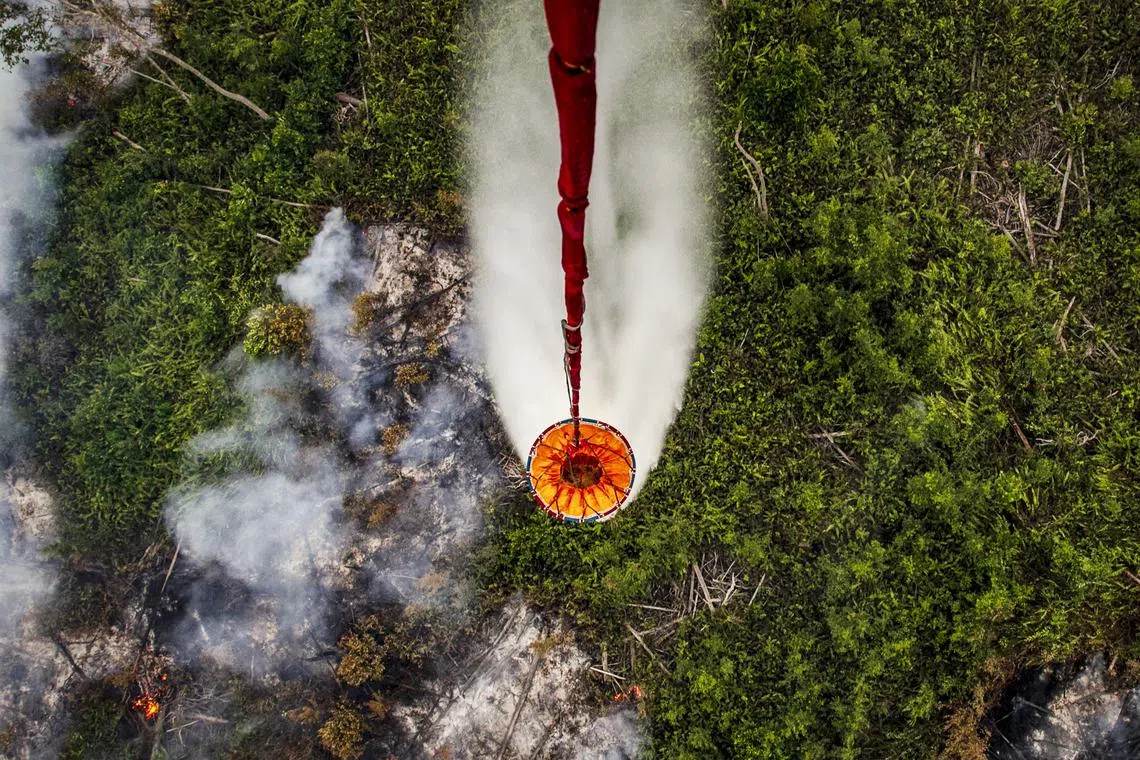 A helicopter releases water from a water sack to extinguish forest fires in Kalimantan, Indonesia, in September 2019.