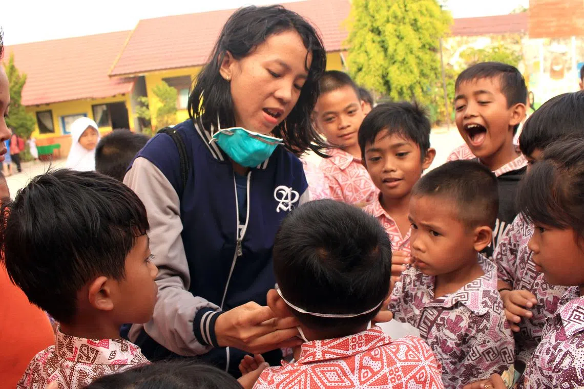 Ms Sumarni Laman distributing masks to a group of children in a village in Kalimantan in 2019.