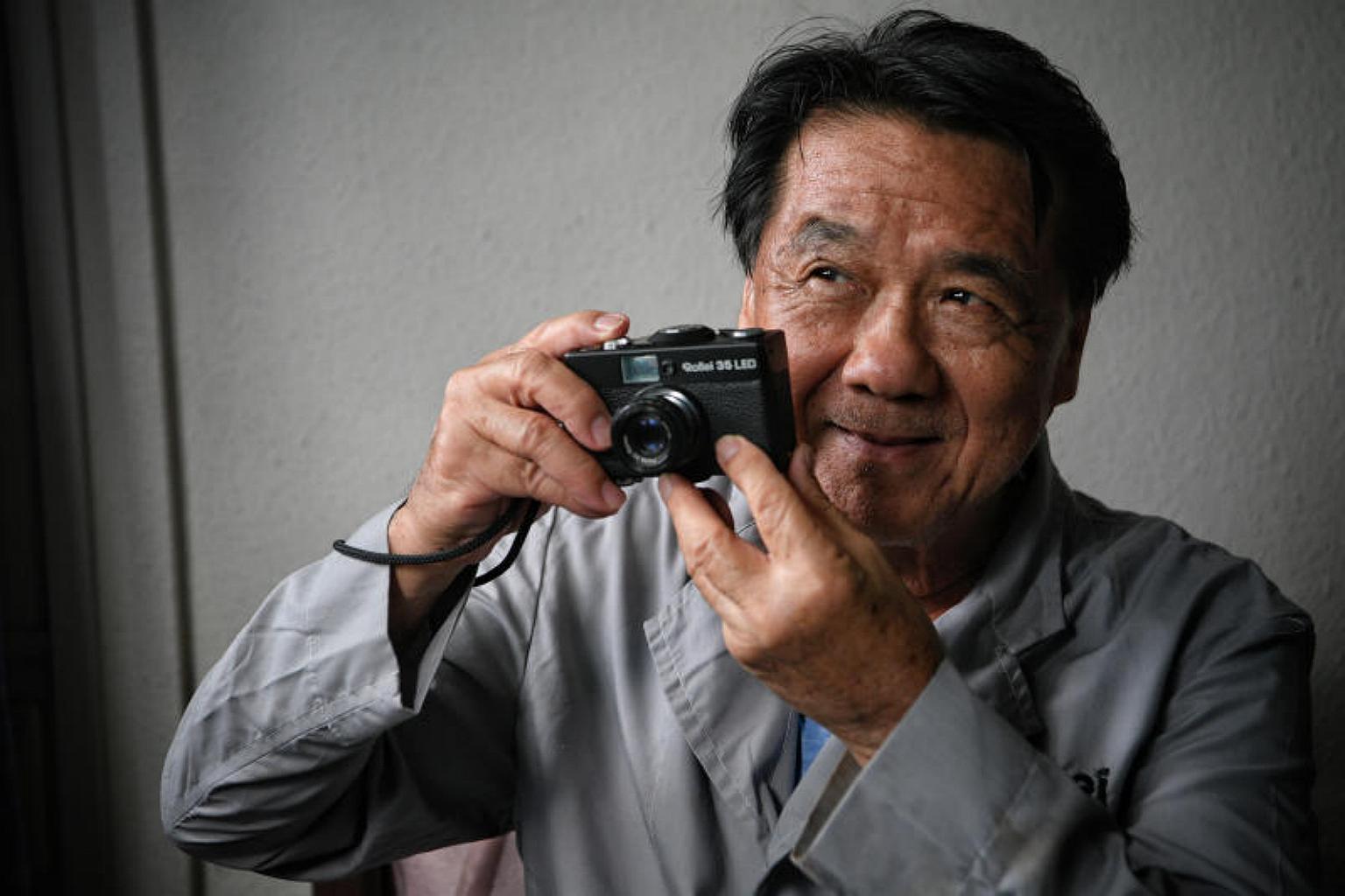 Mr Chong Nam Soy wearing his old Rollei uniform and holding a Rollei 35 compact camera which he assembled in the past.