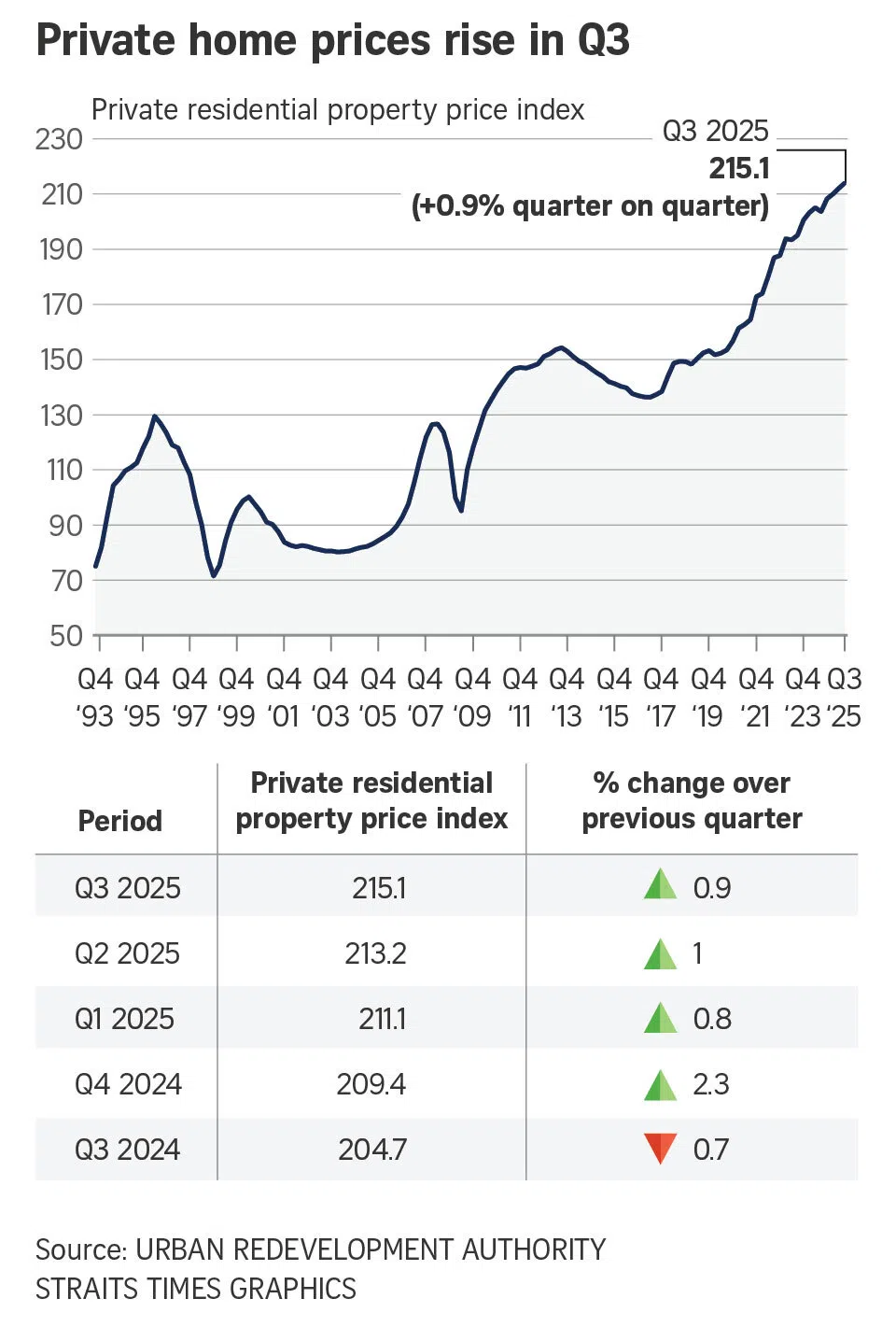 The Urban Redevelopment Authority’s (URA) property price index rose 0.9 per cent from the previous quarter, slightly lower than the 1 per cent increase recorded in the second quarter.