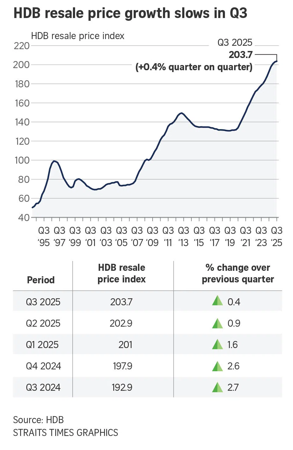 SINGAPORE – Resale Housing Board flat prices saw the slowest quarterly increase in nearly five years in the third quarter of 2025, as the market continued to cool.