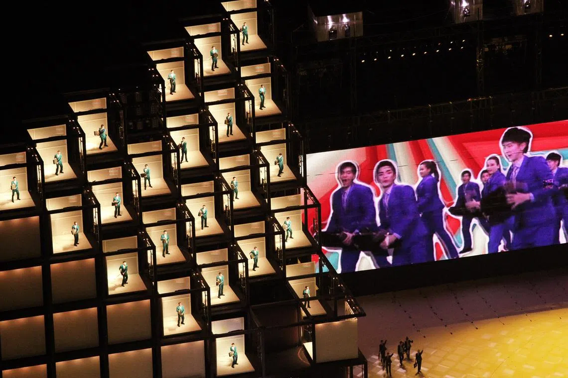 The NDP 2011 stage (left) featured many smaller cubic spaces that could hold performers.