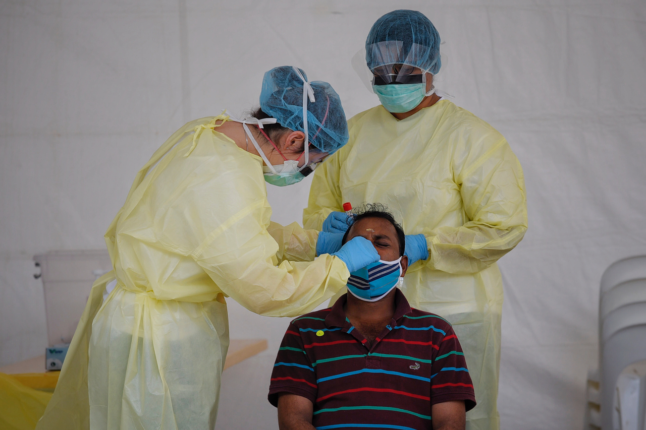 A resident at Westlite Papan Dormitory gets a swab test on April 21, 2020.