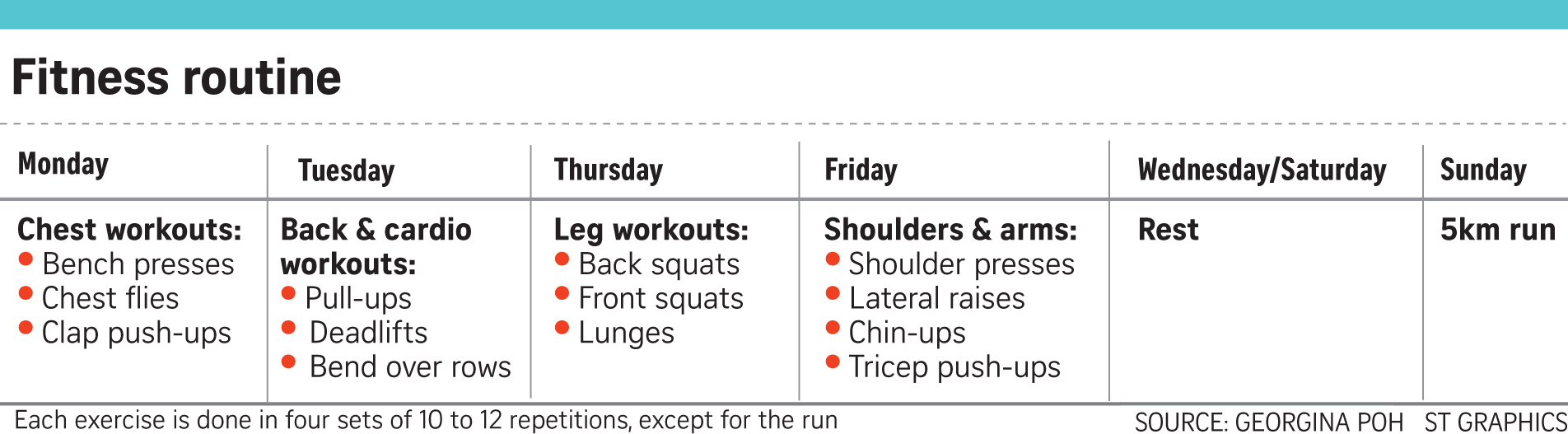 Ms Poh has some strategies to ensure exercise is never boring for her. She works out in the mornings to be energised for the day ahead, varies her exercise routine to keep things fresh, and enlists her boyfriend or her brother's help to push her in the gym.