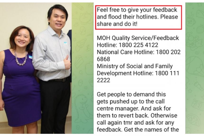The police said that messages sent by the couple had urged the public to call the MOH hotline, the Ministry of Social and Family Development hotline and the National Care Hotline, and also demand that their feedback be pushed up to the respective call centre managers.