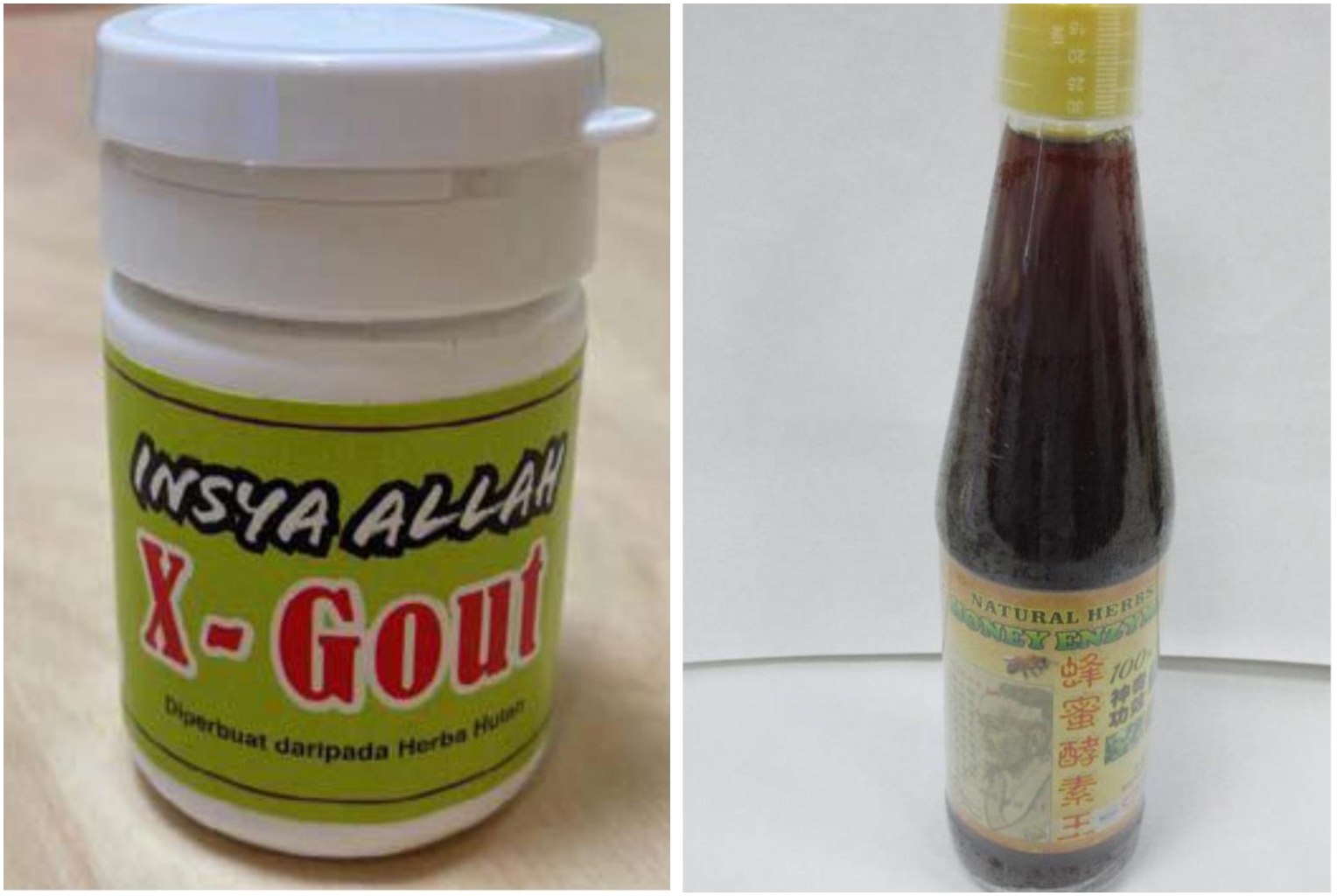 The banned substances were found in X-Gout (left) and dcr Natural Herbs Honey Enzyme, among others.