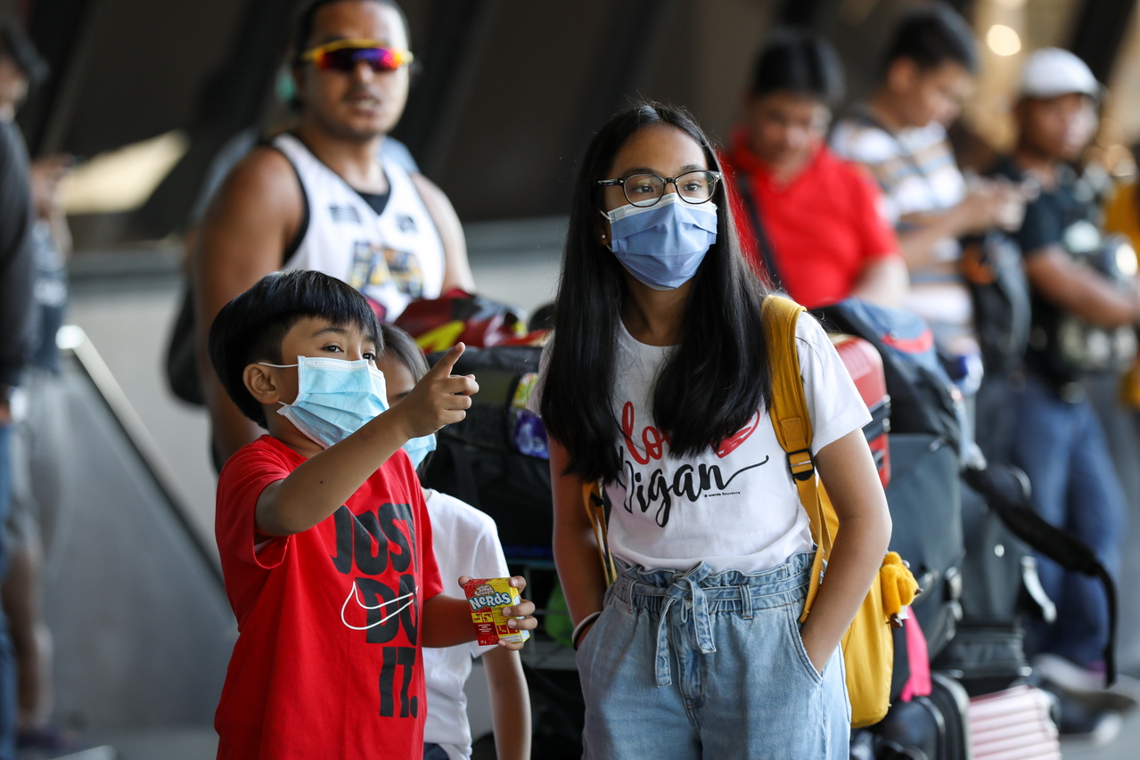 Children wear protective face masks at the Ninoy Aquino International Airport's Terminal 1 in Manila, on March 13, 2020.
