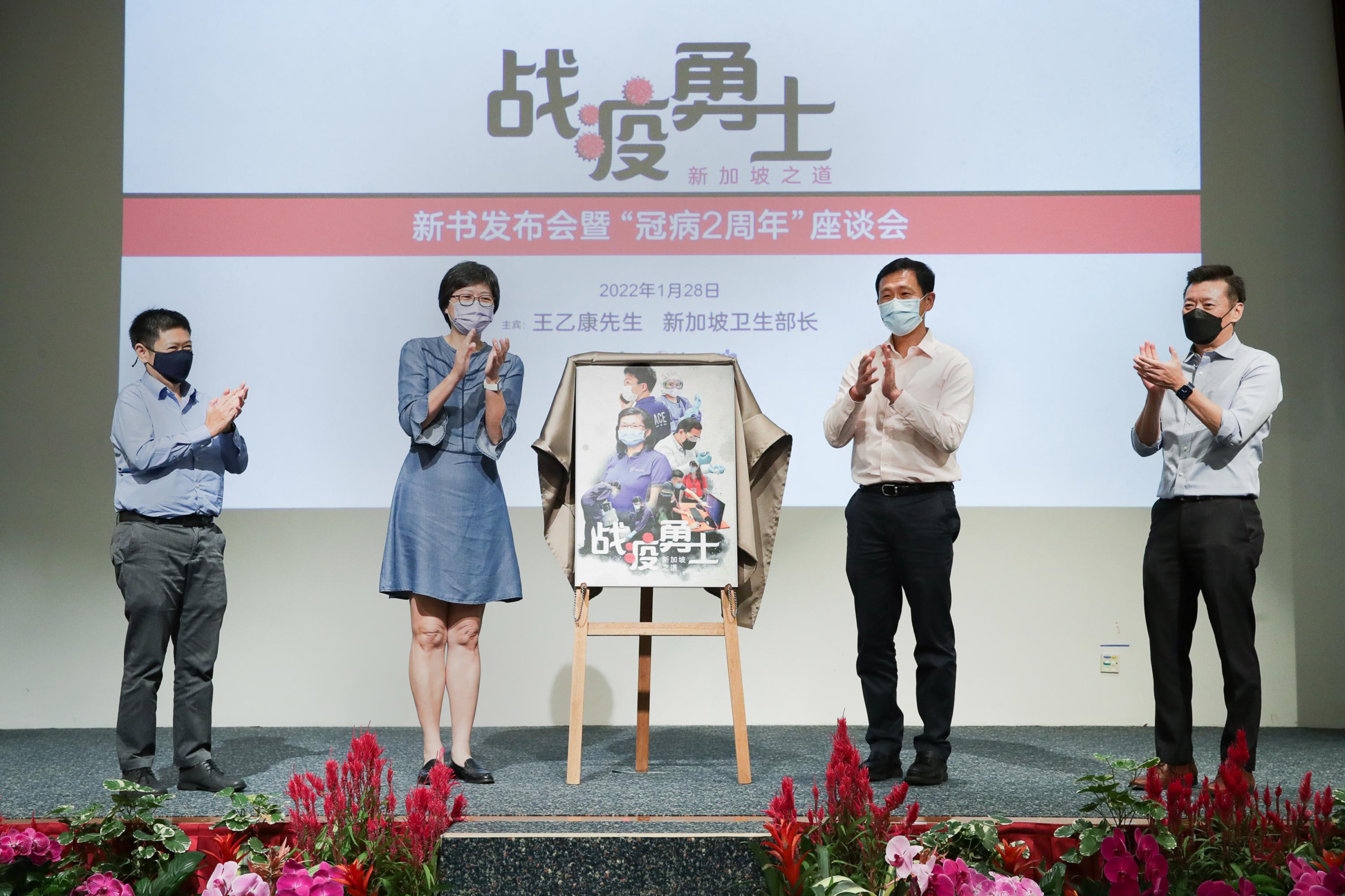(From left) Lianhe Zaobao executive editor Han Yong May, Chinese Media Group editor-in-chief Lee Huay Leng, Health Minister Ong Ye Kung and Lianhe Zaobao editor Goh Sin Teck at the launch of Covid Warriors: The Singapore Way on Jan 28, 2022.