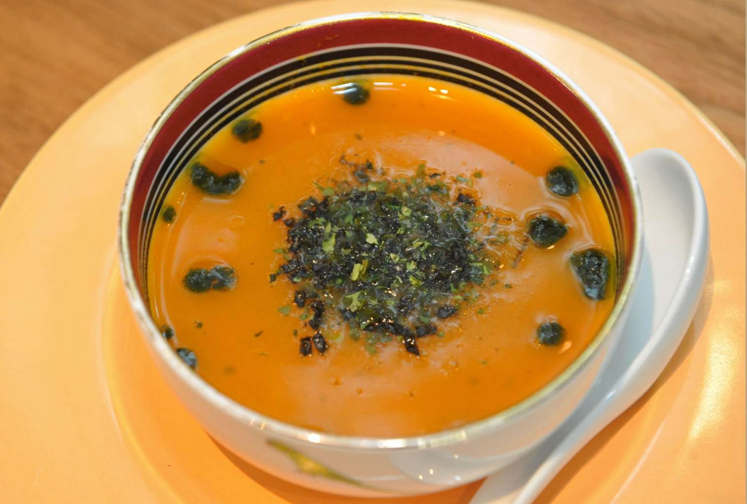 Carrot and ginger soup with dill oil and seaweed topping