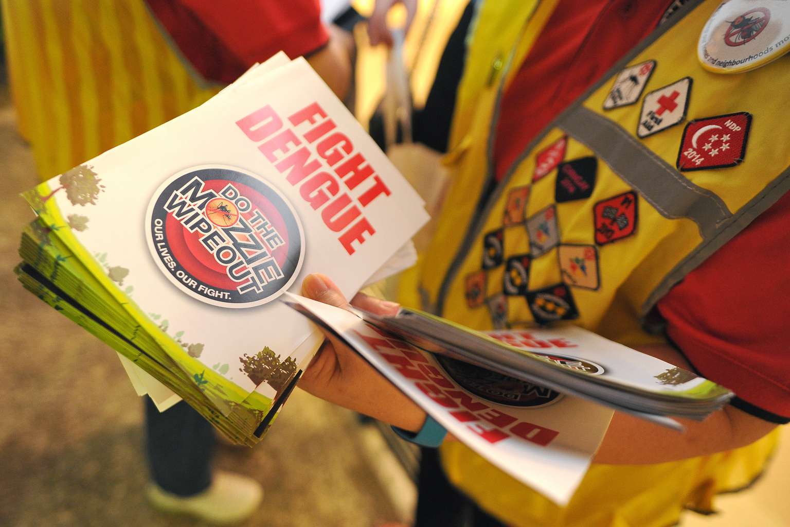 Dengue prevention volunteers distributing flyers that call on residents to fight the mosquito-borne virus.