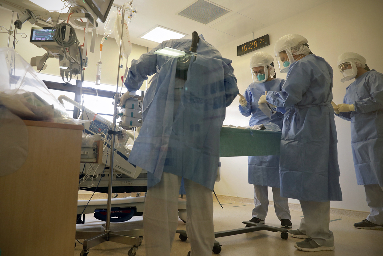 Medical staff in an isolation room at Singapore General Hospital preparing to intubate a suspected Covid-19 patient.