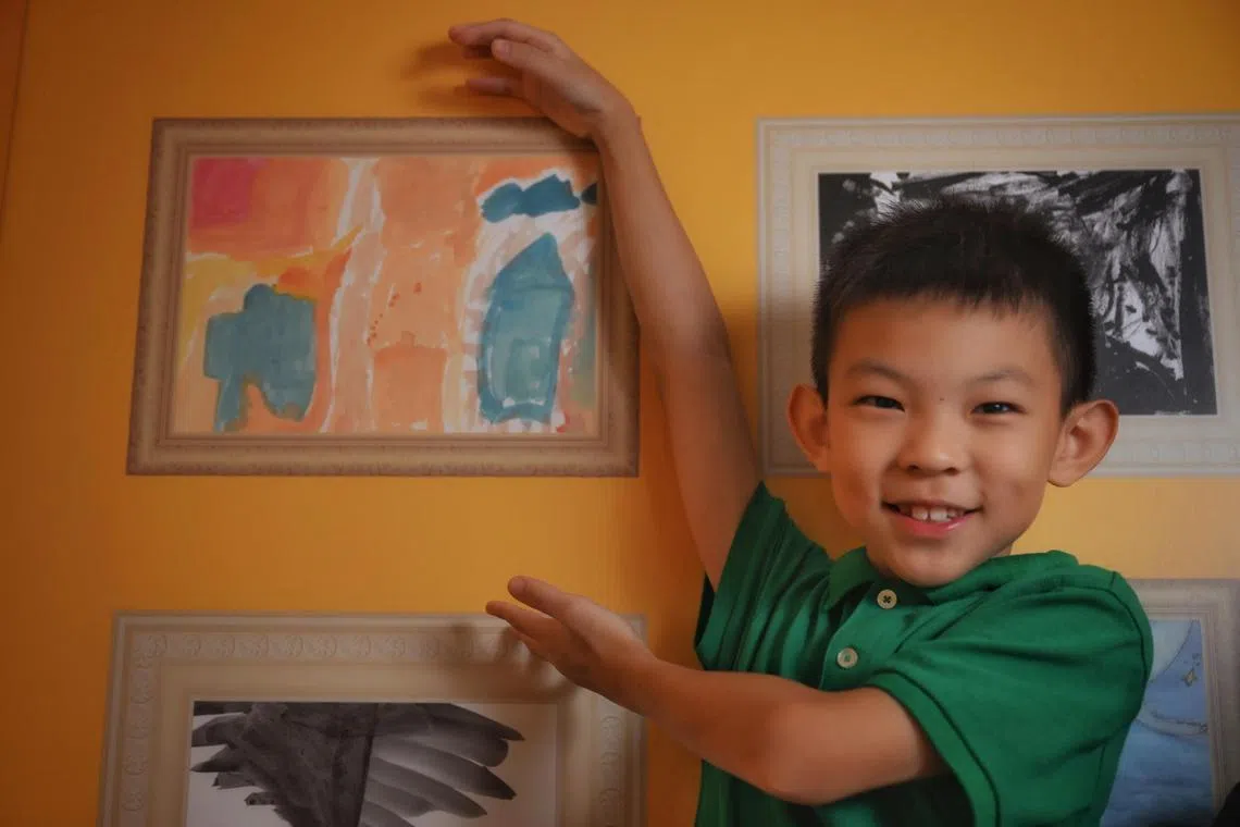 Kendric Chai, eight, with his artwork exhibited at the SELebrate! – The Colours Of Emotion: A Journey In Art exhibition at Bedok Library on June 20.